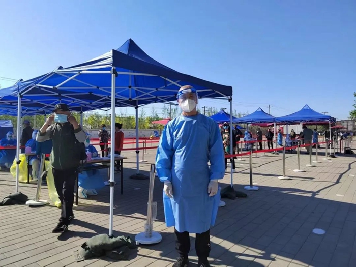 5月16日早上7点半, 我提前半小时来到通州区中仓社区报到,因为第一次参与到核酸检测工作,还比较忐忑,不知道自己能否干好。在与社区负责人对接后,进行了简单的岗前培训,跟随着大家一起布置场地,在社区工作人员的耐心指导下,从开始时维持秩序、保障绿色通道这样简单的工作,到后来我已经能够独立完成身份信息采集、对所采集的样品进行开箱和封箱、帮助检测替换下来的医生进行消毒,并在检测完成后收集场地内的物品,清理、消毒医疗垃圾等诸多工作,一系列工作我一气呵成,他们都夸我是“检测小能手”。